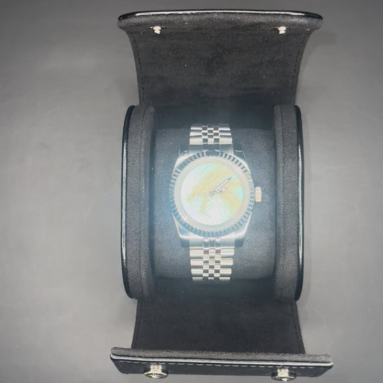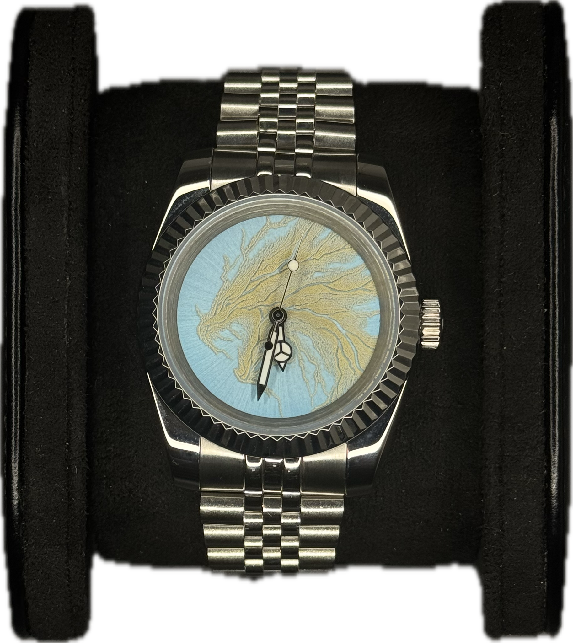 A masterpiece of artisanal craftsmanship where minimalist luxury meets bold artistry. At 39mm, this sleek timepiece features a fluted bezel that catches the light with understated sophistication, housing a dial that's a canvas of handcrafted expression — factory-painted and laser-engraved by me for flawless depth. Powered a renowned automatic movement, it delivers reliable 39-hour power reserve, ensuring seamless performance whether you're conquering the day or winding down at dusk. No manual winding or batteries needed, just wearing the watch is enough for it to wind itself automatically.