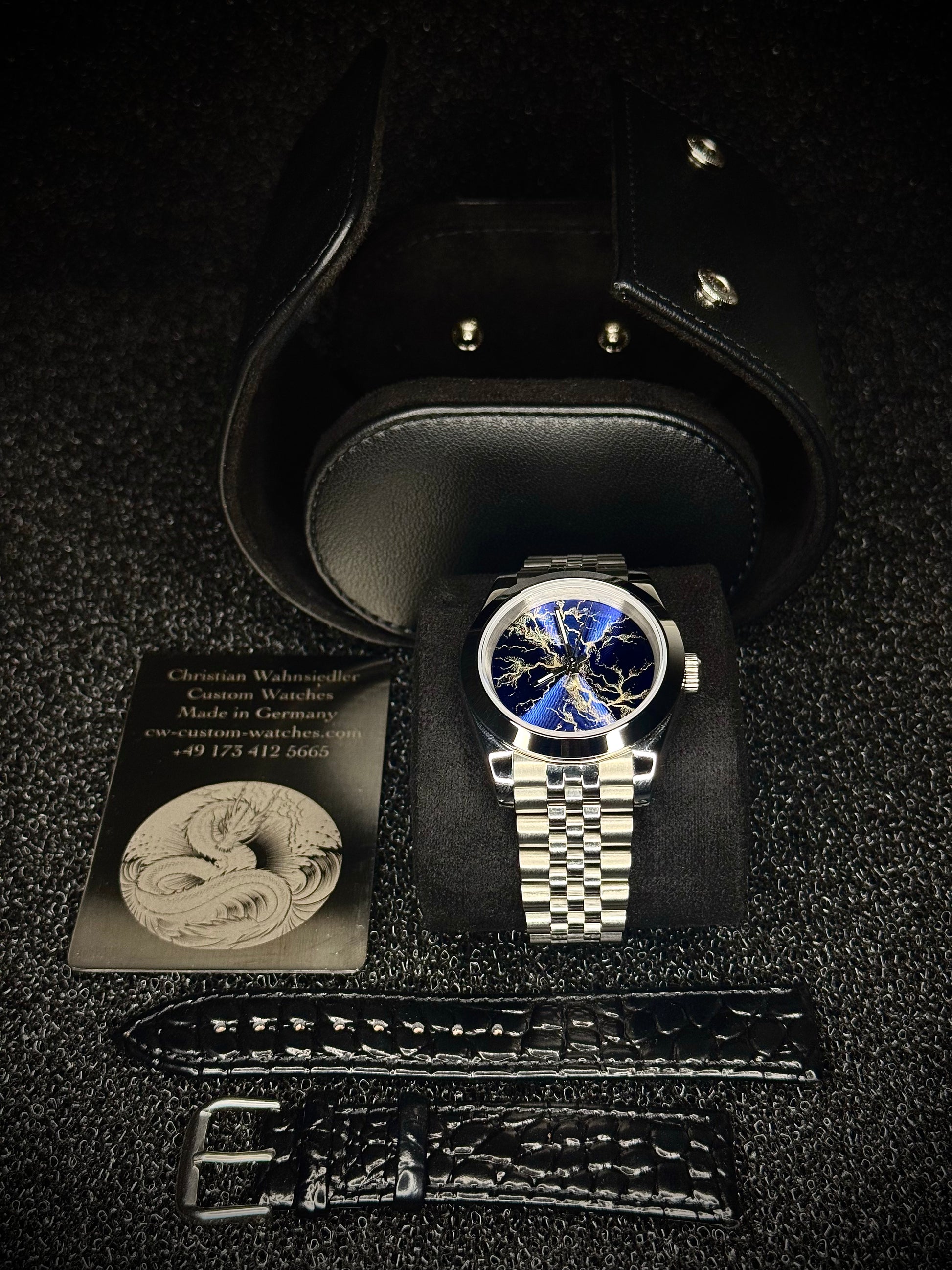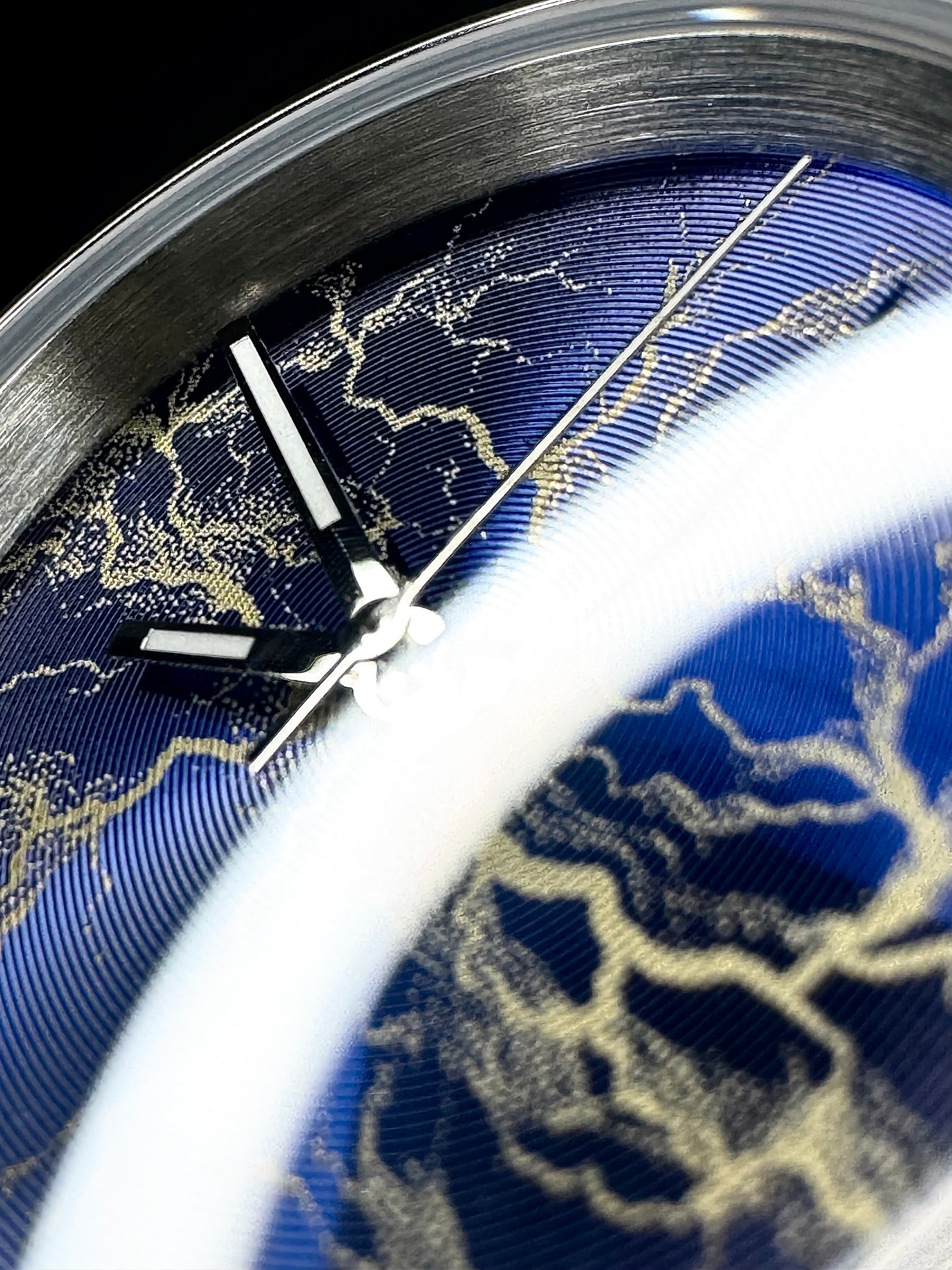 Minimalist mastery: Laser-engraved storm on metallic blue/champagne dial. Quiet power for the trailblazer.